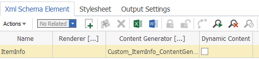 Once you've created and saved the new content generator method, open up your DocumentType for editing. Select the Xml Schema Element tab and replace the tp_ItemInfoContentGenerator with your new method, Custom_ItemInfo_ContentGenerator.