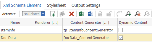 Once the schema changes and content generator method are saved, we need to add a new Xml Schema Element so Aras knows to execute our content generator method when a new Doc-Data element is initialized. On your DocmentType, select the Xml Schema Element tab, click the "Add New" button, and fill the new row as follows: