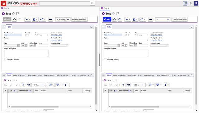 In a recent release of Aras Innovator, the ability to split the screen and see two tabs side-by-side was introduced. One thing this enables our users to do is compre two versions of the same item. However, the existing way of selecting an older version requires too many clicks for some of our users, and they want a more streamlined process. To help them, we're going to be adding to be adding a dropdown to the CUI toolbar of our Part ItemType that will automatically populate with all of the versions of the current Part. Then we'll also add a button to the toolbar that will let our users open whatever version they have selected from the dropdown.