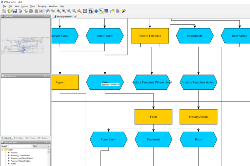 This script basically queries Aras Innovator using our API (IOM.dll) and looks for ItemTypes, RelationshipTypes, and item properties (I haven't handled the PolyItems yet). It converts the result of these queries into GraphML format. This allows software like yEd to layout a human-readable data model diagram, helping you understand the Aras instance being implemented.