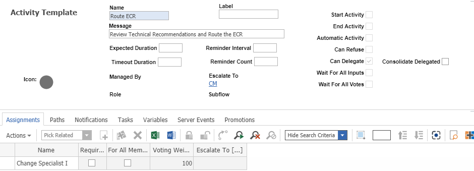 An Activity will also need an Assignment, whether that is set here on the workflow to an identity or team, or left up to the Managed By role to assign ad hoc, somebody needs to be told they have something to do. Automatic activities do not need assignments. You can also distribute the voting weight per assignment. An in-depth discussion of voting weight will occur in a later blog post.