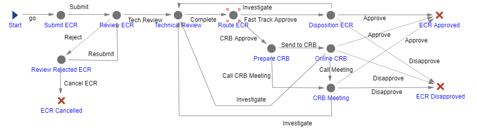 Paths are just that, the lines between activities. These represent the possible voting paths to the next (or previous) step in the process. Paths in Aras can have methods attached to them, and can also be set with an authentication lockout; either to verify the work is complete so users don’t just click through, or to protect an override path like the fast track approve in the example above. Another reason for authentication is an override path: these paths override the voting structure and force the workflow down a specific path, such as cancelling the workflow.