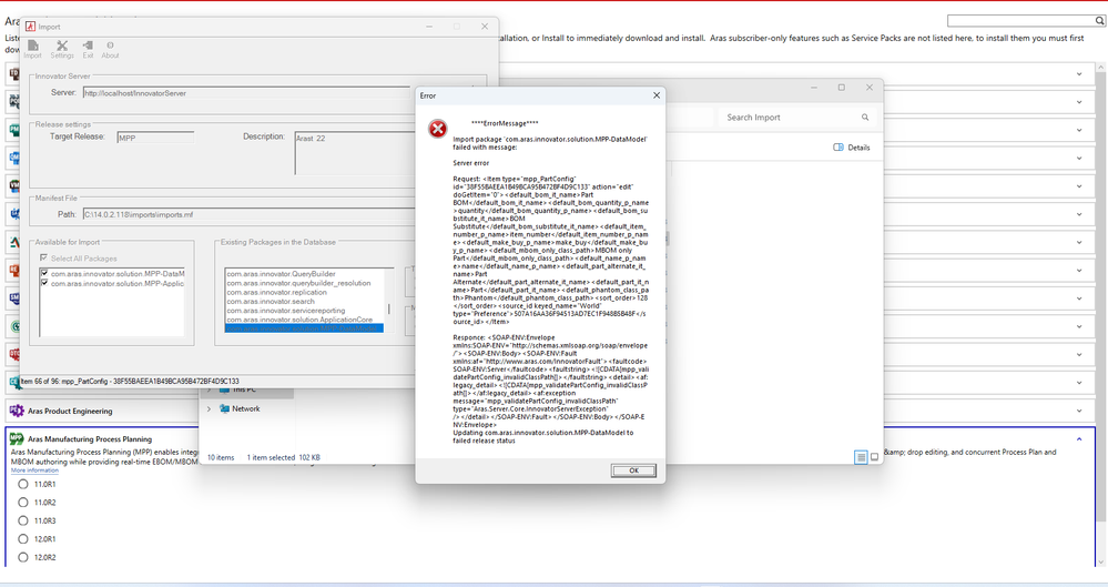 I'm having trouble to install MPP package from Aras Update tool and also tried via PackageImportExport tool, but also without results. Can someone help me?