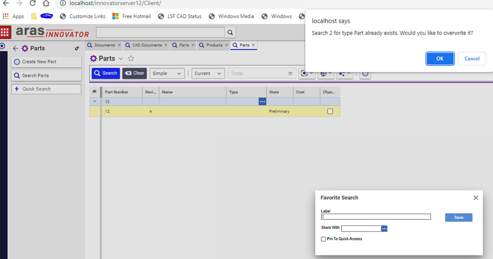 Actually, the overwrite is not working; will create a new entry in favorite search with the same name but with no change on search criteria: