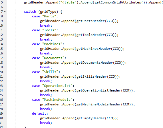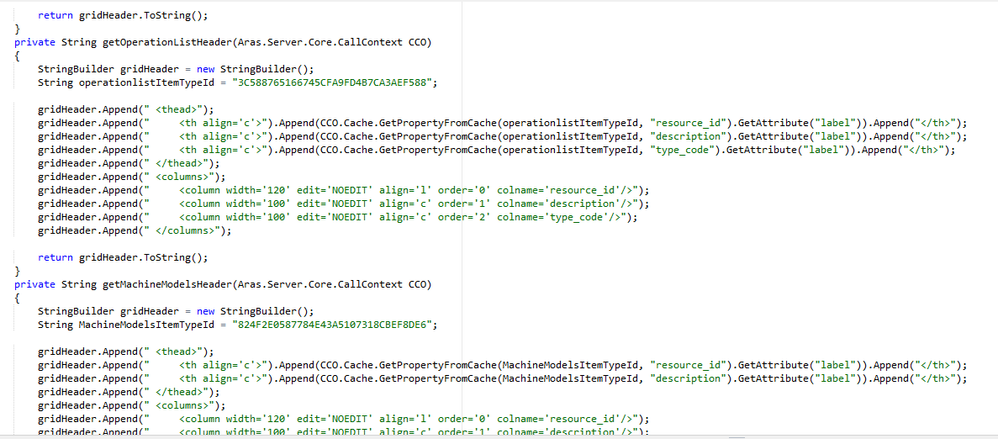 I'm working on Manufacturing process plan in Aras innovator version 11 SP12. I would like to add other items, which have a relationship with operations, in the workbench to select, drag and drop the items into the operation. I tried to modify the method: 'mpp_GetWorkbenchGridHeader' as shown in below picture. but it didn't work? how i can do to add other items along with machines,tools etc. In my case, other items are OperationList, MachineModels as shown in the below image.