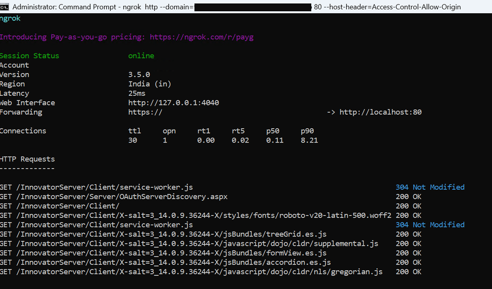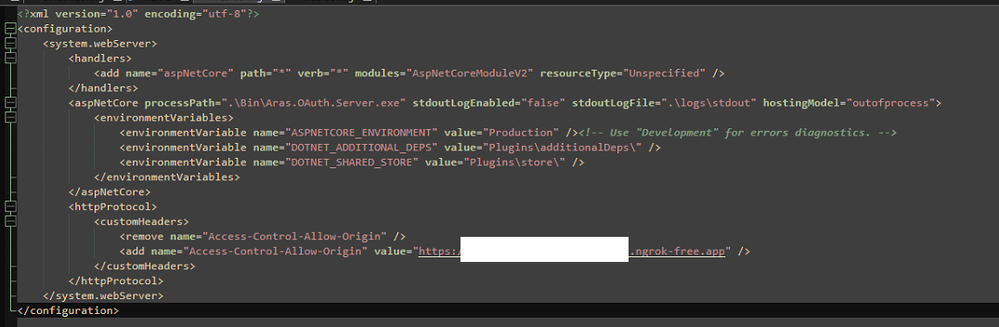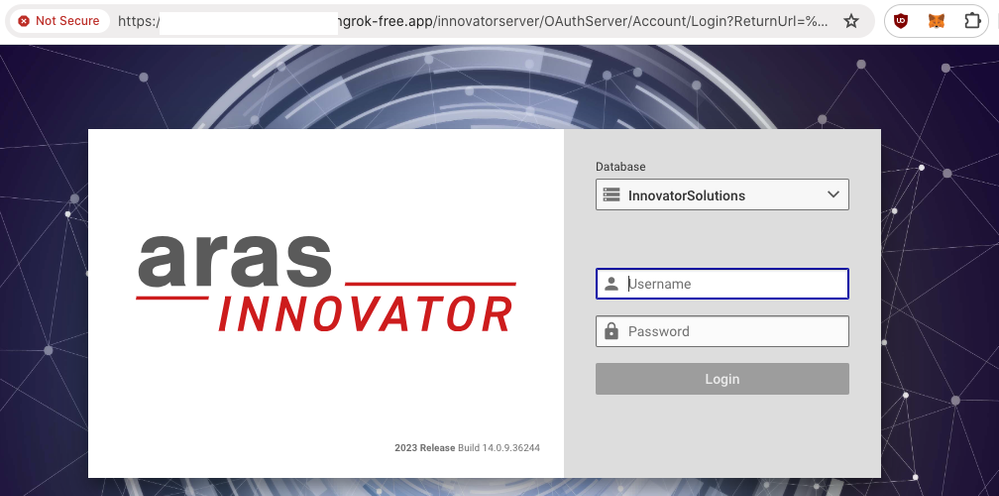 I have installed Aras Innovator 2023 on Windows Server 2022 successfully. I can log in to the Innovator Instance using the localhost URL on the server and the hostname_server URL on the same network machine without any error. I am using the Ngrok Tunneling Client to forward the static domain to the local host to access the innovator Instance outside the network. While doing so, I am receiving an error that states "Error: Cannot access OAuth Server due to CORS policies".