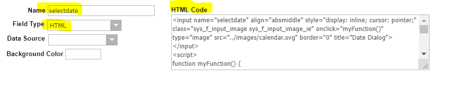 Step 3: For HTML field, give name as selectdate and Label as Empty