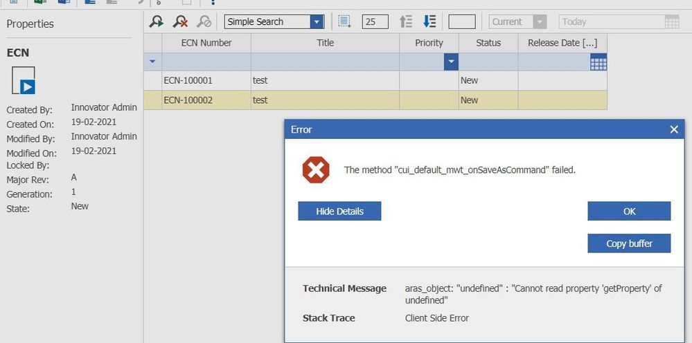On "SaveAs" operation on ECN, getting "The method "cui_default_mwt_onSaveAsCommand" failed." alert message.