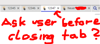 As user may work with a couple of these tabs at the same time, I want to prevent that they accidentally close any of the tabs. They of course can open the TOC View again and continue were they stopped. But it would add a some comfort if a warning message appears where users can decide if they really want to close the tab.