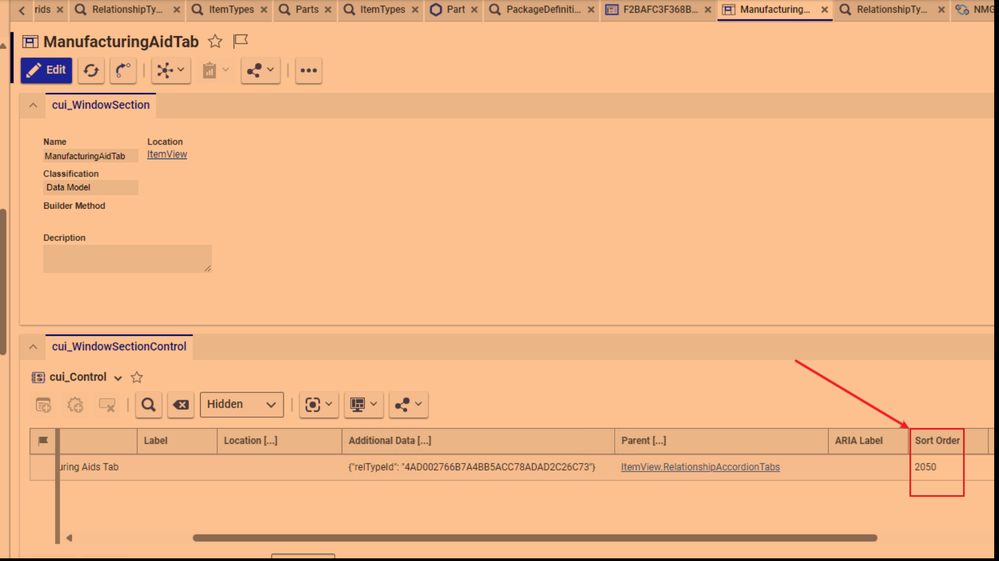 Make sure your CUI entry's sort order is lower than the one you want the relationship to be Infront of.