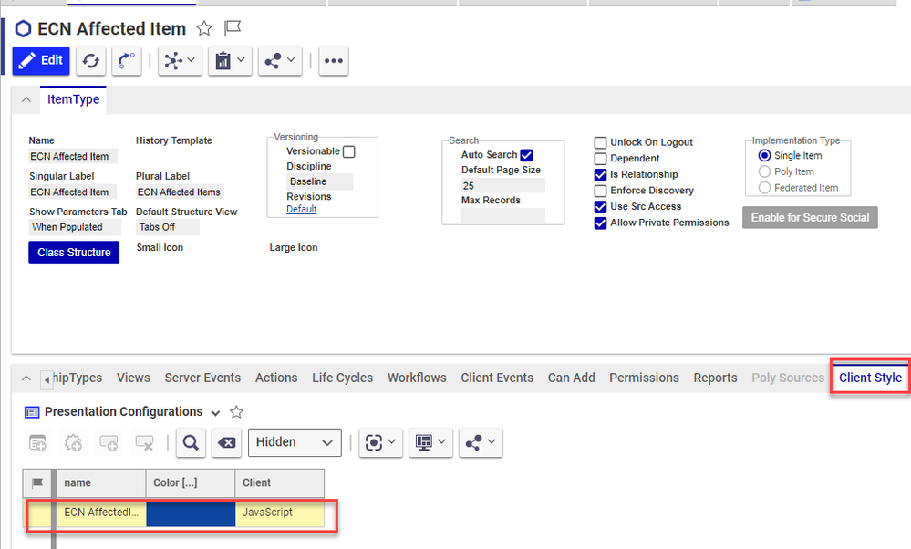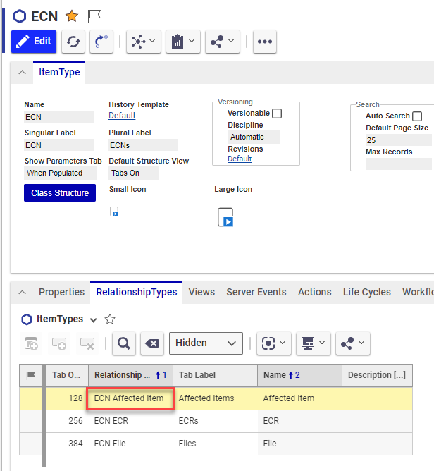 Open the ECN Item and go to Relationships tab. For this example, I am changing the ECN Affected Item.