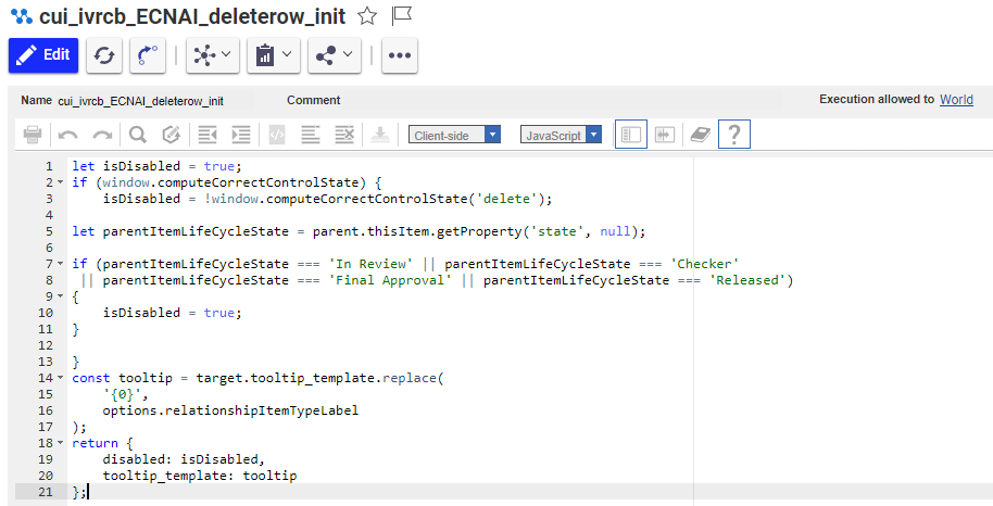 let parentItemLifeCycleState = parent.thisItem.getProperty('state', null);if (parentItemLifeCycleState === 'In Review' || parentItemLifeCycleState === 'Checker'