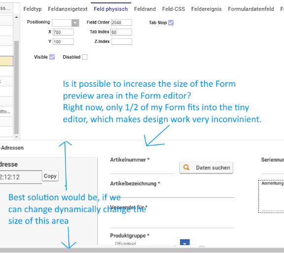 does anyone of you know a way to increase the size of the Form WYSIWYG editor? Or even better: How to change the preview size dynamically?