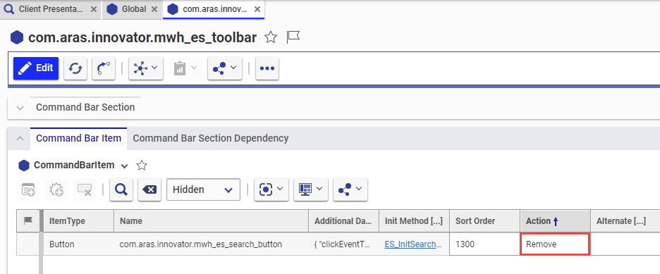 - In the 'Command Bar Item' relationship, find the button 'com.aras.innovator.mwh_es_search_button' and set the action to 'Remove' instead of 'Add'
