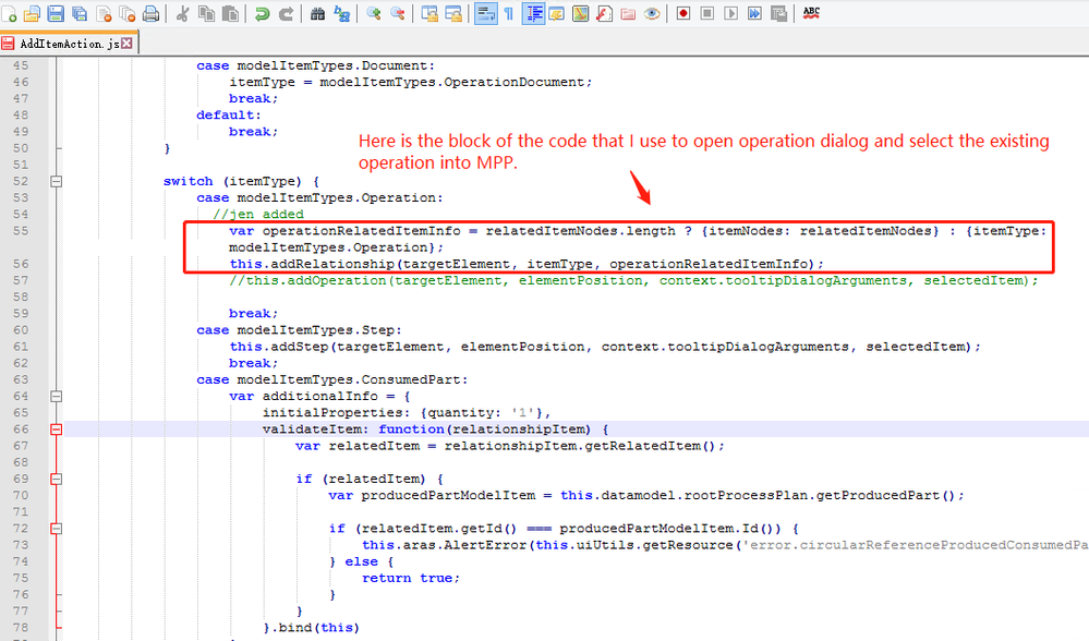 Here is an urgent issue that need your help. In MPP (Process Plan) module, we are trying to change to select an existing operation instead of inserting an operation manually in MPP. Since I updated the code as Screenshot below, the operation dialog works as I expected, but the Operations we selected does not save into database, of course it does not show in the mpp panel as well. please see the screenshots below.