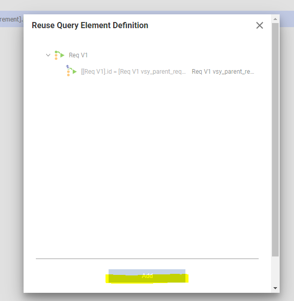 I am trying to create a recursive query to look at children, I try by using Reuse Query Element Definition but unfortunately its not working and when i select the element add button freezes as can be seen below.