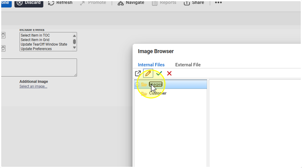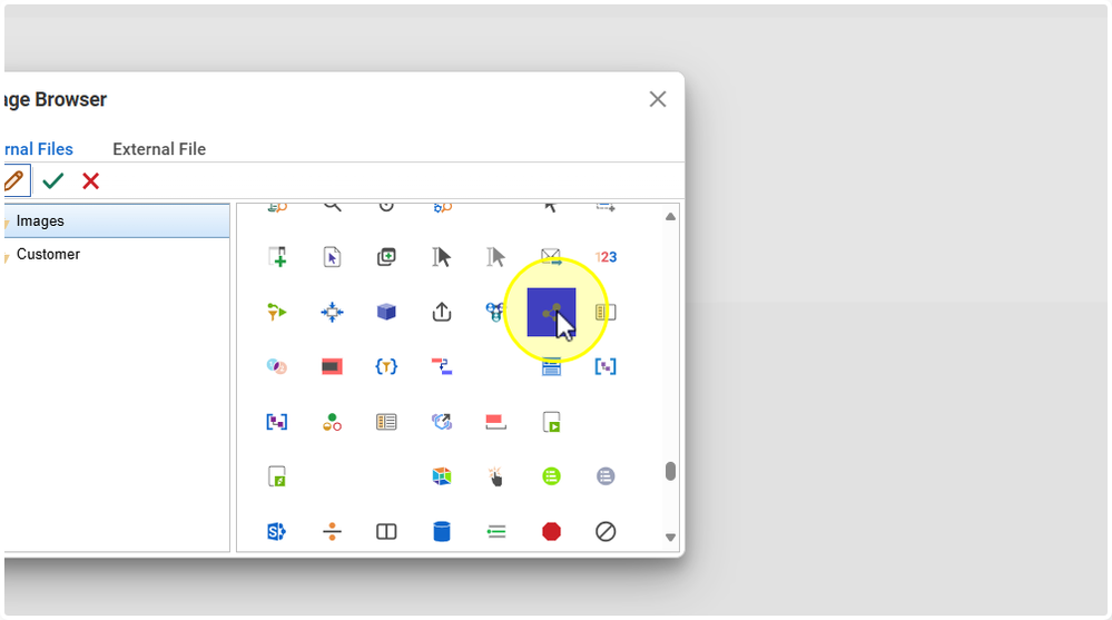 - For the Image property, select the icon you want to use via the Internal Files tab in the image selector.