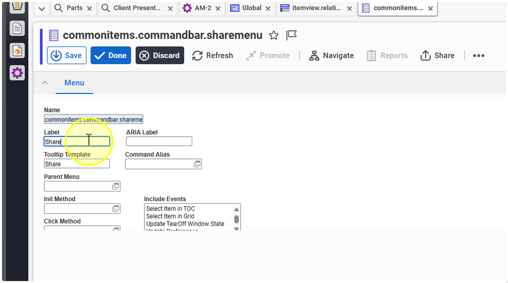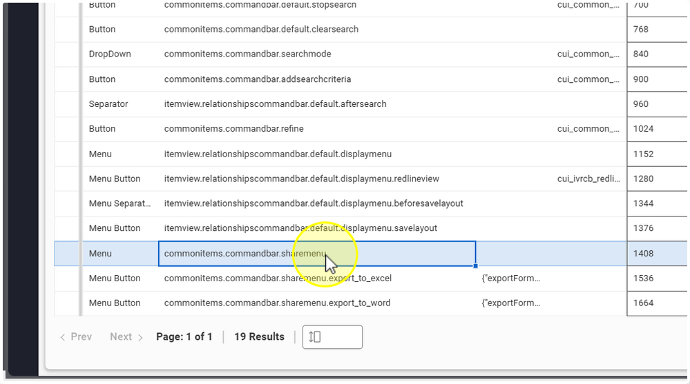 - In the CommandBarItem tab, open commonitems.commandbar.sharemenu and click Edit.