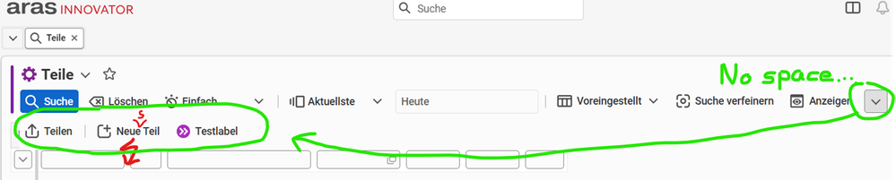 Aras has simplified the toolbar CUI buttons, aligning them more closely with the current - but questionable - trend of overly clean design. As a result, the icons have become harder to distinguish. To compensate, labels were added, but they take up a significant amount of space. The situation worsens when using the German or French language pack, where labels are typically 30- 40% longer. In that case, there’s hardly any pixel left for custom elements, often forcing the toolbar to wrap into a second row.