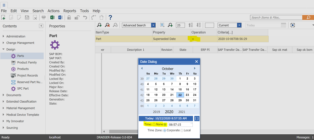 The Simple search mode was written to work with an equals condition by default. Because of this constraint, the time field is intentionally disabled when doing a Simple search. Finding a part created on a particular day might be useful, but finding a part created at a specific time on a specific day is not typically.