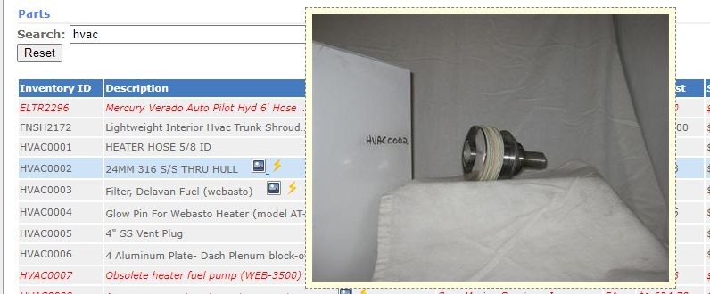 Here is a screenshot from the legacy system we migrated from, where the user has moused-over one of the image icons shown, to display the thumbnail for the part in a larger temporary popup window (that disappears when they mouse away from the image icon):