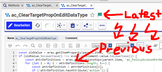 If you now save your "fake" previous item, the latest item will be overwritten with code and properties of the previous version. This is a high danger situation not only for Methods, but for all ItemTypes that use revision as it will lead to data loss and corrupted data.