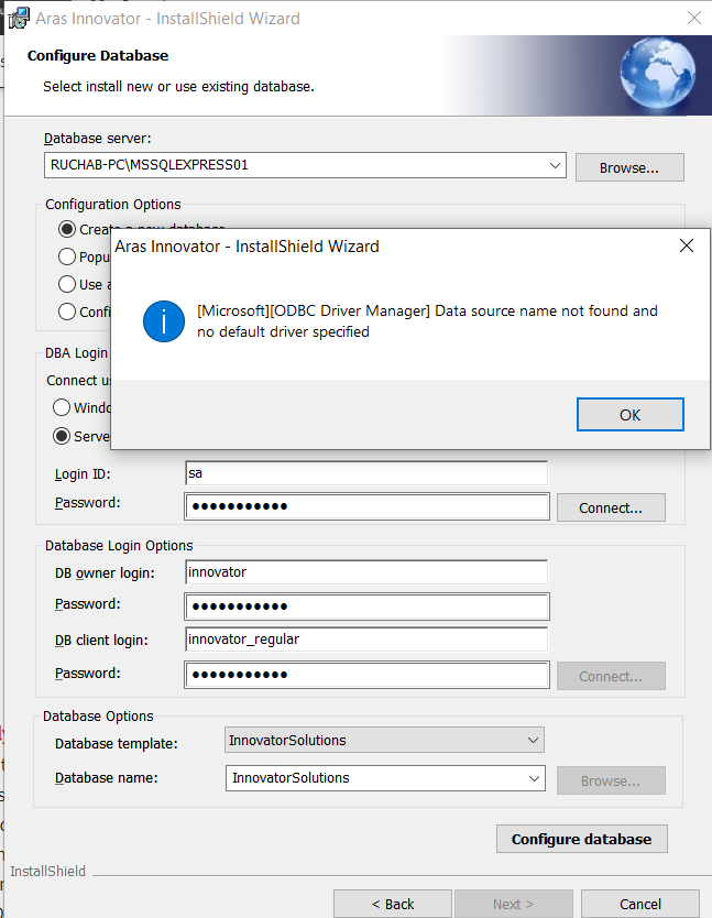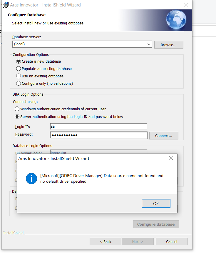Ensure that the required ODBC driver for your database is installed on your system. For Aras, commonly used databases include Microsoft SQL Server or Oracle. Make sure you have the corresponding ODBC driver installed.