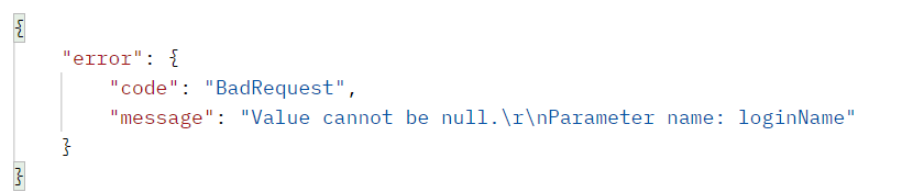"message": "Value cannot be null.\r\nParameter name: loginName"