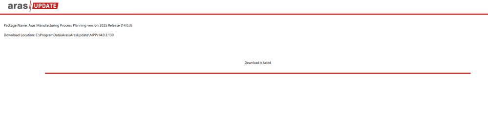 When attempting to download Manufacturing Process Planning version 2025 Release (14.0.3) via Aras Update, the "Download is failed."