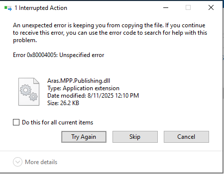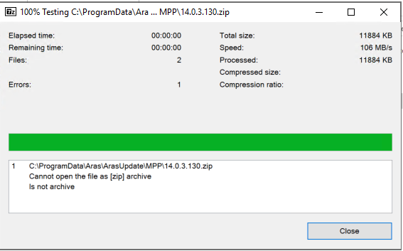 Opened C:\ProgramData\Aras\ArasUpdate\MPP and attempted to manually extract 14.03.130, and extract fails: