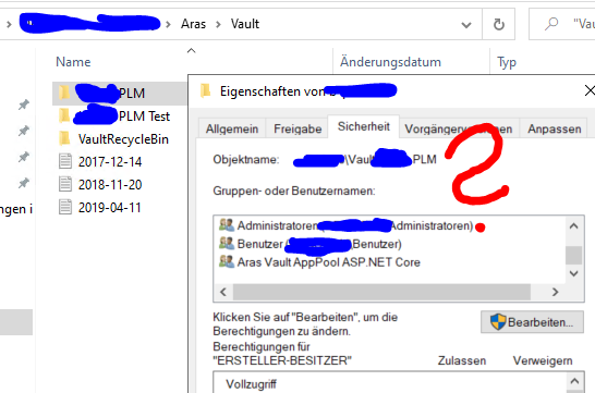 All regular files that are still in use contain permission for "Aras Vault AppPool .NET Core".