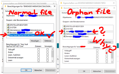 But most (not all...) orphaned files doesn´t contain this permission anymore. Instead they contain a permission for a local user account. When I add the Vault AppPool permission manually, I am able to delete the file.