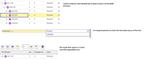 Hello, I'm looking through the community forum for some information regarding filtering/searching on PE_BomStructure tree grid view and query definition. I've got a multi-level BOM that I'd like users to be able to filter by Part Number ( string or item). I followed the Query Element Builders Guide and the blog post "Filter a Tree Grid View with Parameters"; however it only works with the parameters at the top level. Is there any way to effectively filter the 2nd level rows and return the expandable level 1 rows where the item is found? I added a visualization in the attachment.0Views0likes3CommentsPass a Property to a Search Grid